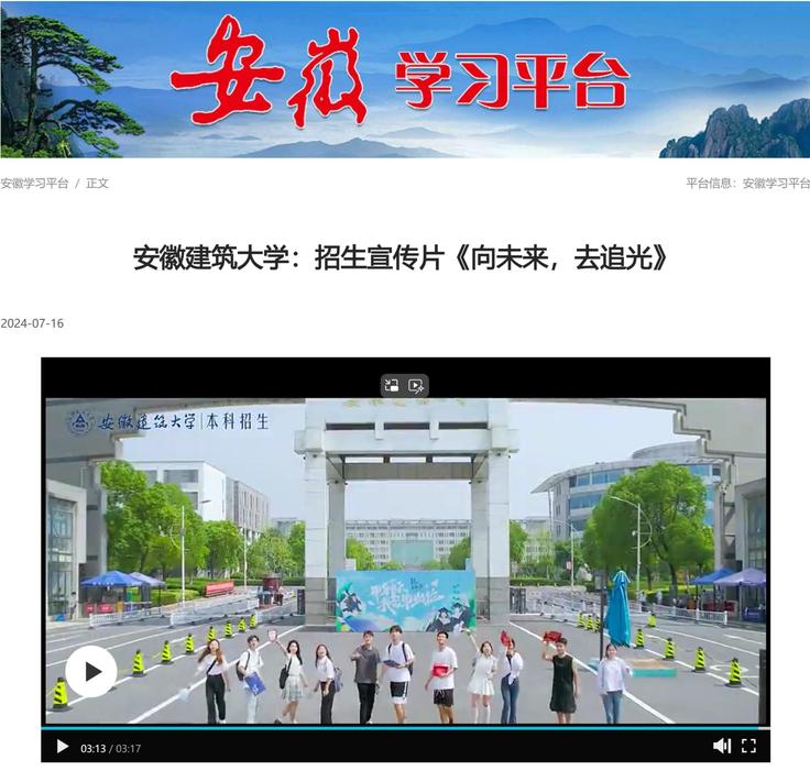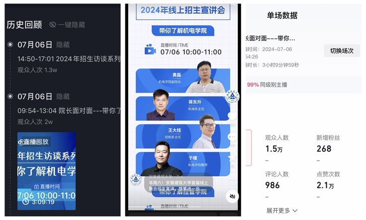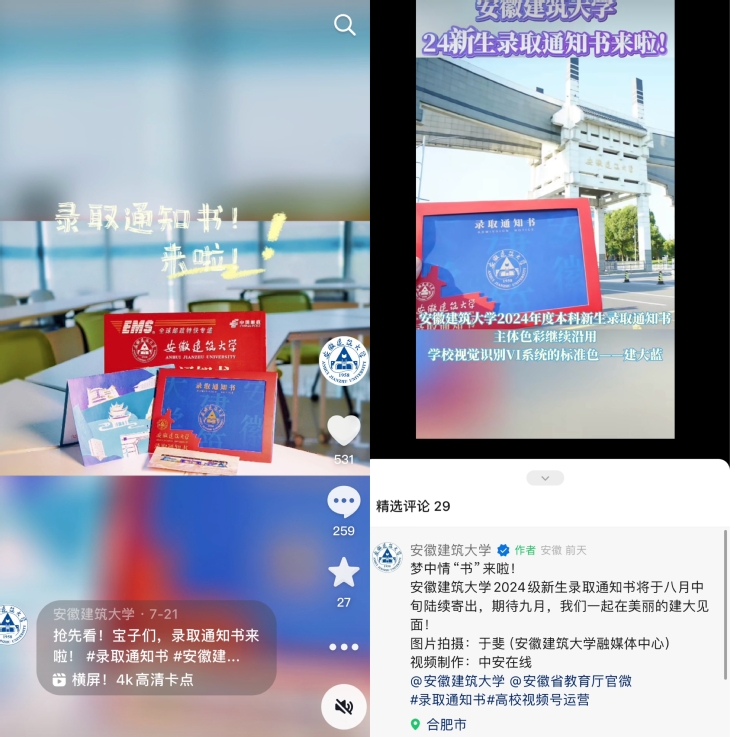 在学校2024年度招生宣传片《向未来、去追光》发布后,第一时间在学校多个媒体平台推送并向学习强国全国平台、安徽平台推荐上线,全网观看量刷新历史新高。7月5日,宣传部通过抖音、微信等平台发布预告信息,预热7月6日的抖音直播招生宣讲。招生办联合部分学院利用学校抖音平台开展直播宣讲,与广大考生、家长线上热烈互动,累计观看量超过26万,受到家长、考生的高度好评和认可。