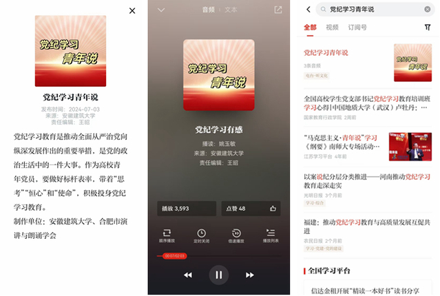 本网讯 近期,由ku游官方建规学院建筑系教师党支部书记许杰青、景观系教师党支部书记姚玉敏、城乡规划专业学生党支部书记王昊禾录制的“党纪学习青年说”专题,在学习强国电台“听文化”频道发布。