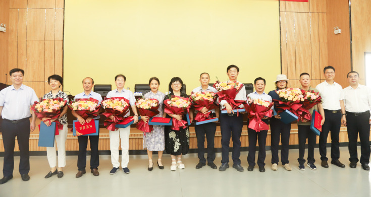马文革、黄显怀为荣休教职工颁发荣休证书和纪念品,蔡国军率青年教师代表为各位荣休教职工献上鲜花,表达真挚的祝福。