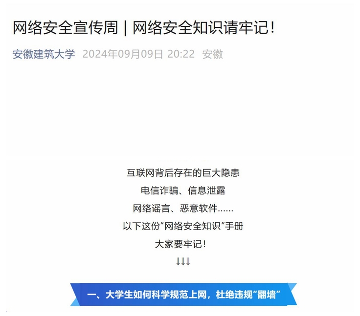 党委宣传部积极发挥校园媒体教育引导作用,利用校园电子屏、校园网集中展示“网络安全为人民、网络安全靠人民”宣传轮播图;通过校园广播发布《教育部思想政治工作司关于组织开展2024年国家网络安全宣传周校园日活动的通知》,号召广大师生积极参与相关活动;新媒体推出“网络安全宣传周:网络安全知识请牢记!”微信推文,广泛宣传网络安全理念、普及网络安全知识、提升师生网络安全意识。