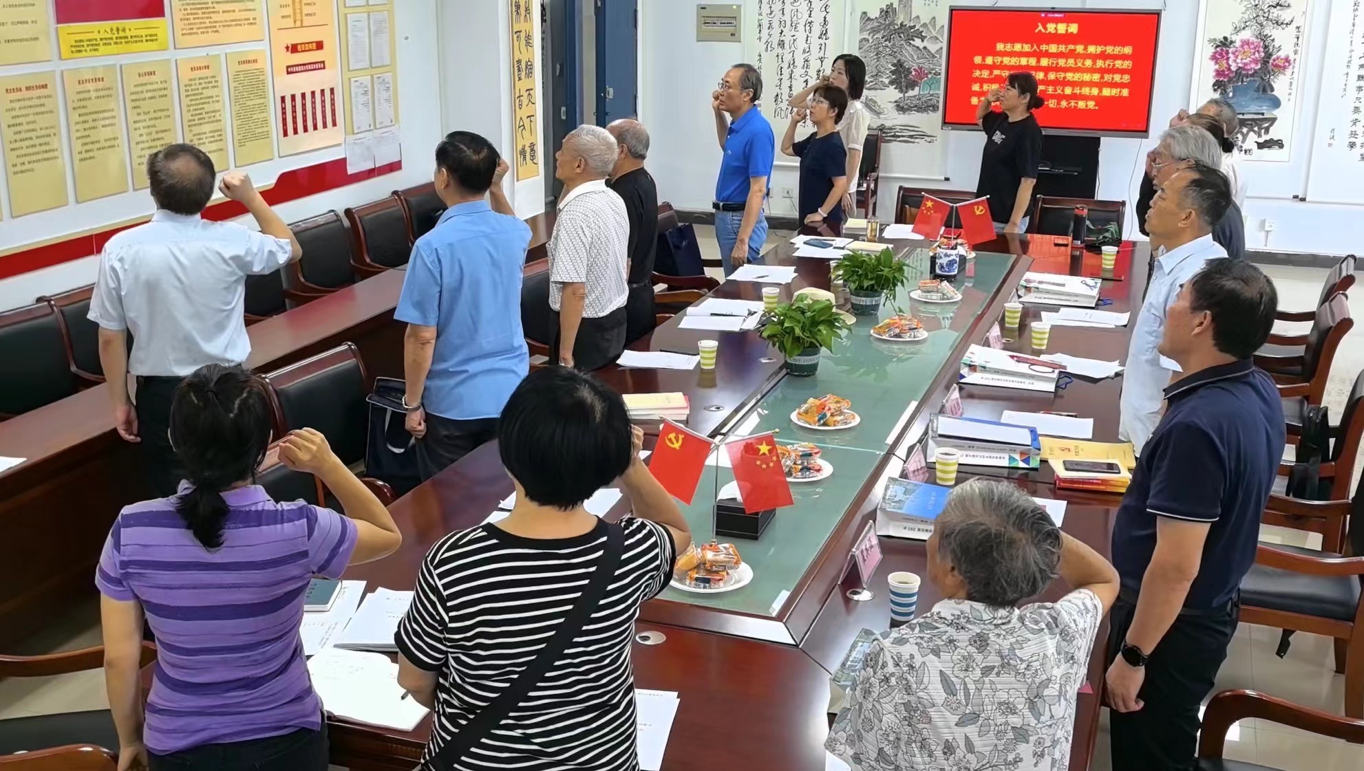 活动在参会人员共唱国歌中开始。胡传健、龚乃胜、李传红、瞿其强、陆梅华等5位10月份入党的同志与参会党员一起集体重温了入党誓词。在座谈环节,与会老党员们结合自身经历分享了入党感言,畅谈了祖国发展变化。在党的领导下,创造了经济快速发展奇迹,社会长期稳定奇迹,国泰民安,人民安居乐业。老同志们纷纷表示,会始终听党话、跟党走,积极发挥余热,永葆党员本色。