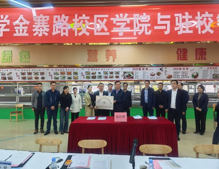 金寨路校区学院与驻校餐饮企业现场签署结对协议,黄显怀为餐饮企业授牌。
