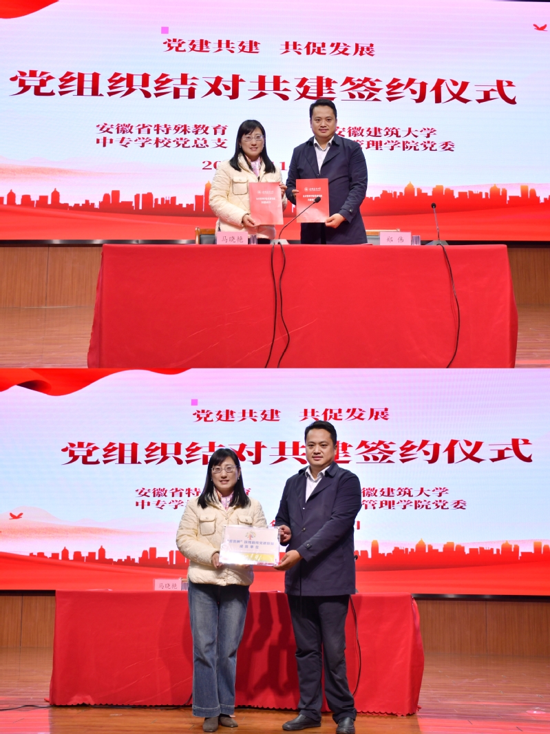 随后,郑伟介绍了残疾人职业教育及省特教中专学校党建、发展等工作情况。公管学院党委副书记(主持工作)马晓艳介绍了学院基本情况、基层党建的经验和成果,并围绕双方共建党建品牌探索多元合作形式,通过党建合作搭建发展桥梁,拓宽思路、共同发展。双方就学院党委加入省特教中专学校“常青树”扶残助残党建联盟进行了详细商谈,并就深化落实党建共建、党建带团建、活动开展、业务支持等工作达成了一致意见。郑伟与马晓艳签订党建共建协议,并举行了加入“常青树”扶残助残党建联盟入盟授牌仪式。