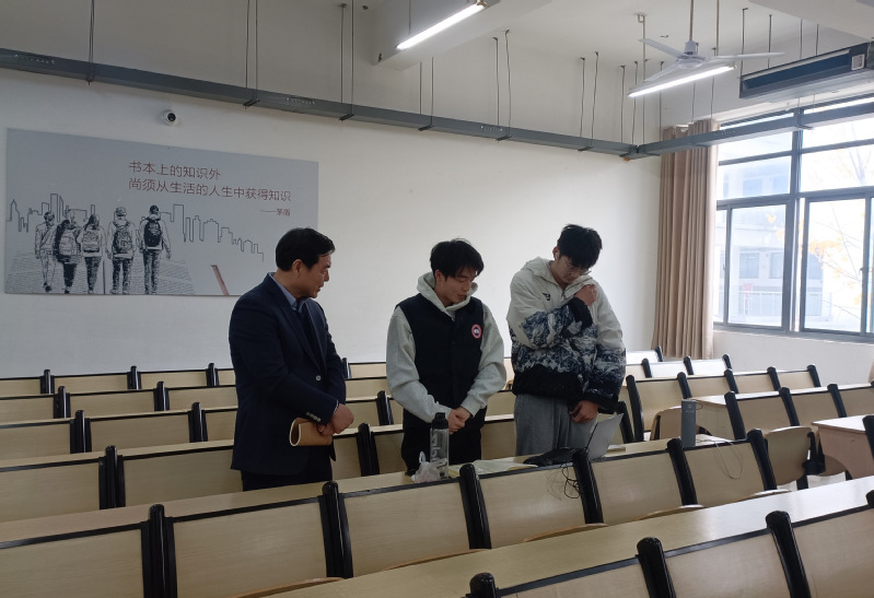 随后,黄显怀深入一线教师课堂对教师课堂授课、学生听课开展随机巡课听课。他指出,课堂是学校教育教学工作的主阵地,是落实立德树人根本任务的关键环节,加强巡课听课是推动教风学风建设的重要举措;要坚持问题导向,加强制度设计,持之以恒推进课堂教学常态化监督检查,切实保障课堂教学质量。在巡查教室教学设施和仪器设备时,黄显怀与自习学生亲切交谈,鼓励同学们要扎实掌握专业知识、积极思考探索未知,不断提升综合素养。