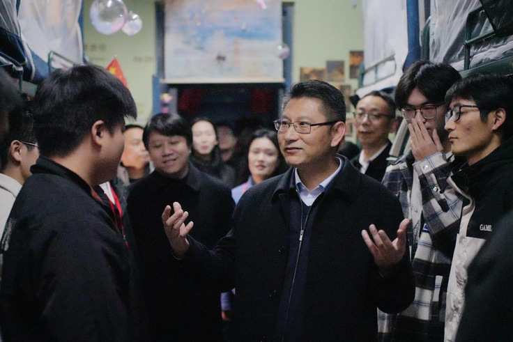 在紫云路校区16栋学生宿舍,马文革与同学们进行深入交流,仔细了解同学们的日常生活情况、作息规律以及课外文化活动情况,亲切地与同学们“拉家常”,并叮嘱同学们要养成健康的作息规律和生活习惯,合理安排学习和课外活动,处理好寝室关系,珍惜四年大学生活时光。