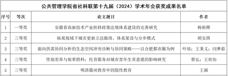 本网讯 近日,安徽省社科联公布了第十九届(2024)学术年会获奖成果名单,ku游官方公管学院在本届年会中荣获一等奖1项、三等奖4项,展现了学校在社会科学研究领域的实力与风采。