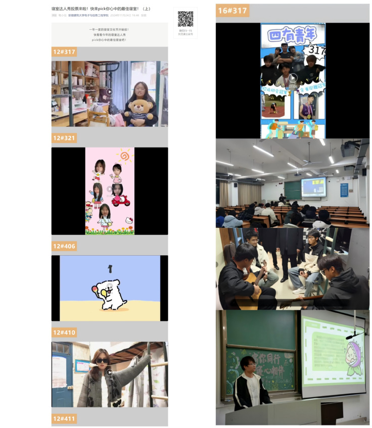 线上评比展示环节于11月24日开启,活动通过易班·今日校园和微信公众号平台进行成果展示和线上投票,展示页面呈现各宿舍特色风貌,有的简约雅致,用绿植与书法点缀;有的以科技蓝为主调,彰显专业特色。师生线上轻点投票,在青春氛围中感受寝室创意文化,于无声处为心仪之 “寝” 助力。