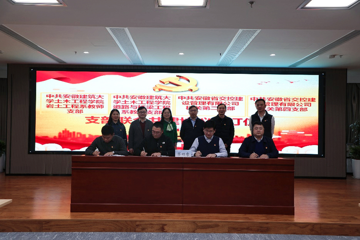 随后,校企双方在安徽省交控建设管理有限公司会议室举行共建启动仪式。安徽省交控建设管理有限公司党委副书记、工会主席赵孜博主持共建启动仪式。中共安徽省交控建设管理有限公司机关第二支部书记、工程计划部部长王波,中共安徽省交控建设管理有限公司机关第四支部书记、质量安全部部长赵可肖,ku游官方土木工程学院道桥系教师党支部书记、系副主任周宇,土木工程学院岩土系教师党支部组织委员林键分别介绍支部基本情况、支部建设、政治理论学习、“三会一课”党日活动等工作情况,并在校企双方领导的见证下,进行了支部共建签约仪式。