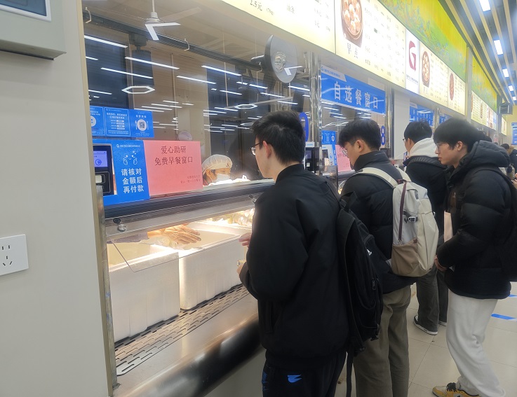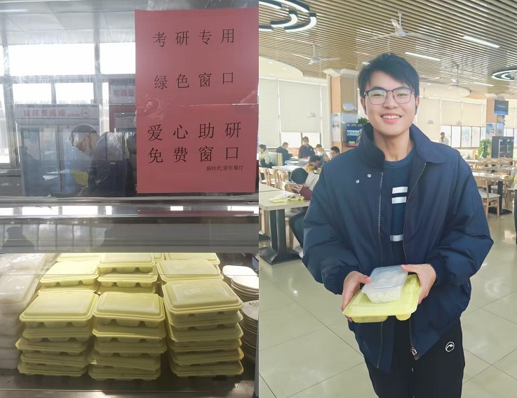 研考当天早上,学校各一楼食堂给每位考研学子提供免费“爱心早餐”一份,就餐大厅还设置考研助力台,提供文具、暖宝宝、纸巾、糖果等物品。