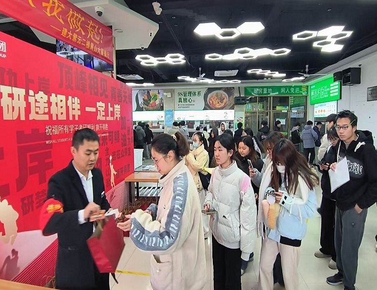 研考当天中午,部分食堂为考生提供了一定比例的免费中餐券和鸡腿兑换券,并开展“研途相伴,一定上岸”抽奖活动,帮助同学们缓解考试焦虑。各食堂均设置考研专用绿色窗口,提供优惠营养套餐,供同学们选择。同时,就餐大厅延迟关闭空调,并提供红糖姜汤和开水等热饮,为跨校区考生提供温暖舒适的休息场所。