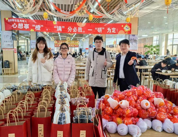 12月20日中午,学校各食堂在就餐大厅为考研学子精心准备“考研大礼包”和暖冬小礼物,给他们送去祝福和鼓励,预祝他们心想事“橙”,实现自己的梦想。