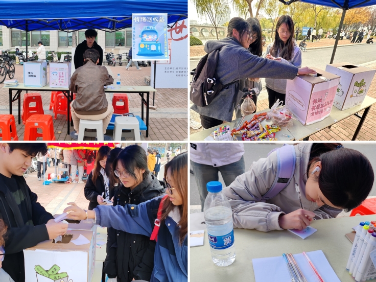 机电学院于紫云路校区北食堂门口举办“情绪盲盒”心理主题活动,活动场地设置了“情绪垃圾箱”和“快乐分享箱”两个情绪盲盒,同学们纷纷写下自己的快乐或者烦恼投入对应的盲盒之中,并且随机抽取盲盒中他人的纸条。在放入和拿取的过程中,成功搭建起一座连接内心世界与现实生活的桥梁,收获别人快乐的同时也在消化着心中的烦恼,引导同学们共同感受情绪释放。