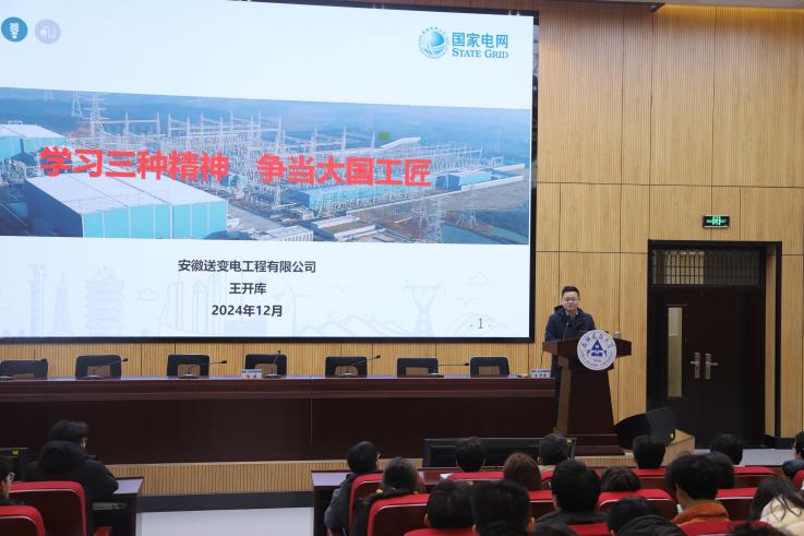 王开库工程师以“学习三种精神,争当大国工匠”为题,结合亲身经历诠释了爱岗敬业、争创一流,艰苦奋斗、勇于创新,淡泊名利、甘于奉献的劳模精神、崇尚劳动、热爱劳动,辛勤劳动、诚实劳动的劳动精神;执着专注、精益求精,一丝不苟、追求卓越的工匠精神。他用“特别能吃苦、特别能战斗、特别能忍耐、特别能奉献”以及“特高压精神”诠释了这三种精神。他希望同学们坚定信心,打好基础,以坚强的意志和崇高的理想,把个人发展与国家社会需要相结合。