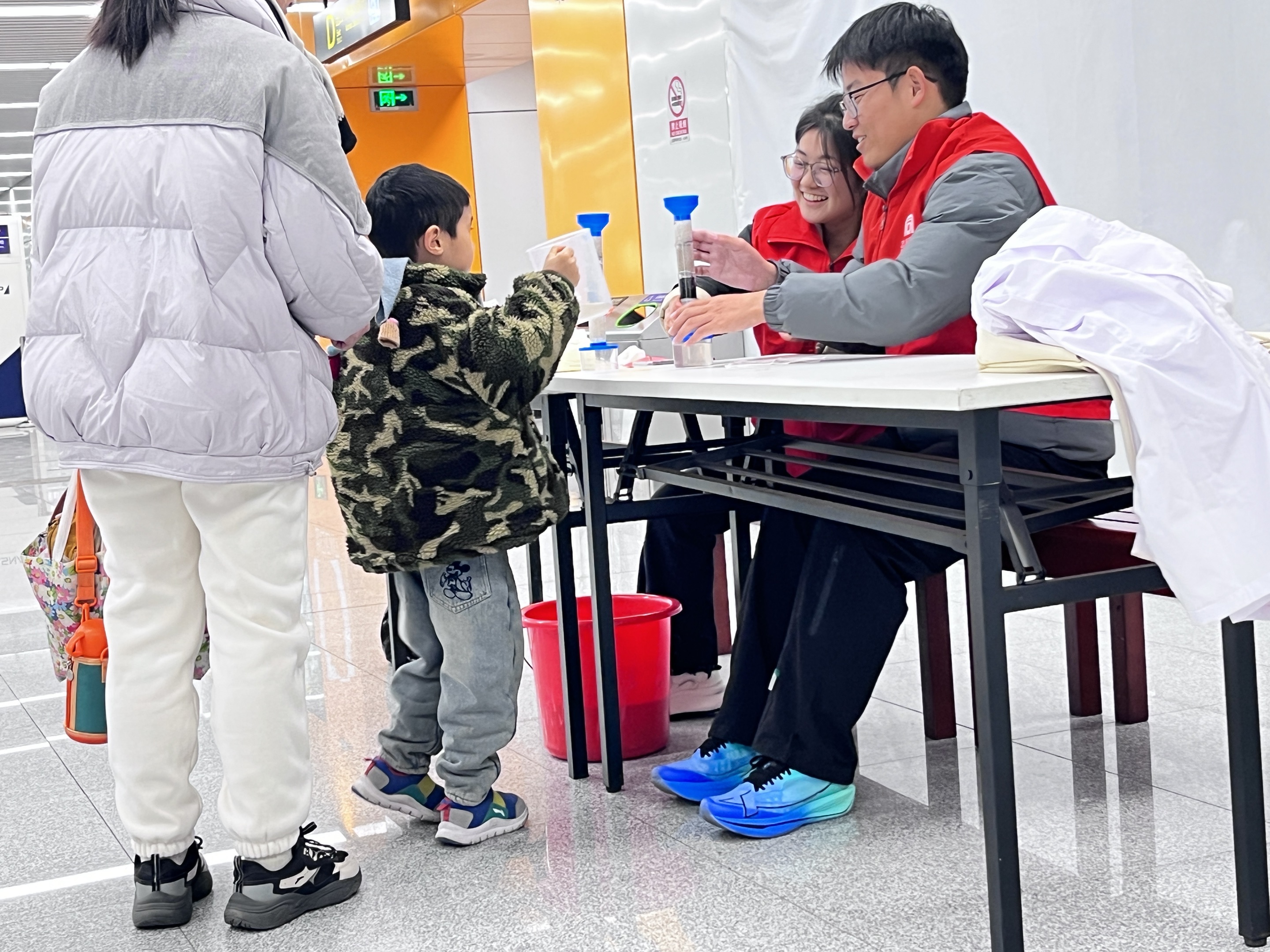 在活动现场,给排水科学与工程专业和环境生态工程专业的学生们利用所学专业知识,为过往乘客带来了一场别开生面的污水净化实验演示。他们熟练地操作着实验仪器,有条不紊地向大家展示污水净化的过程。为了让现场的小朋友们能够更加直观、深入地理解,学生们采用了通俗易懂且充满趣味的讲解方式,将复杂的污水净化原理拆解开来,耐心地引导小朋友们观察每一个实验步骤中水质的变化,帮助孩子们探索“干净的水”究竟是如何而来。在这个充满好奇与探索的实验过程中,孩子们不仅亲眼目睹了污水变清水的奇妙转变,还学习到了许多关于水的科学知识,比如水的循环利用、水污染的危害以及水资源的珍贵性等。更为重要的是,通过这样亲身体验的方式,在孩子们幼小的心灵中悄然种下了环保意识的种子,让他们从小就懂得珍惜水资源、爱护环境。