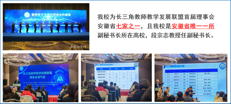2024年12月,我校成为长三角教师教学发展联盟首届理事会七家安徽省高校理事单位之一,且我校是安徽省唯一一所副秘书长所在高校,段宗志教授任副秘书长。