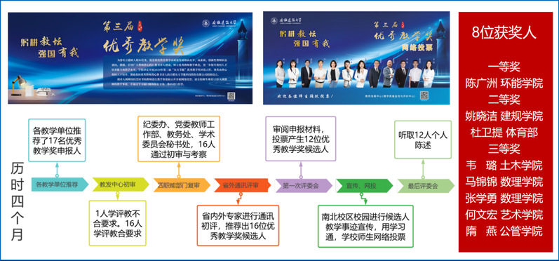 自3月份开始,经教学单位推荐、教发中心初审、学校四个职能部门初审与考察、省外专家通讯初评、校内评委会评审、网络投票、校外专家现场会评七个环节,历时四个月,最终评选出一等奖1名,二等奖2名,三等奖5名。