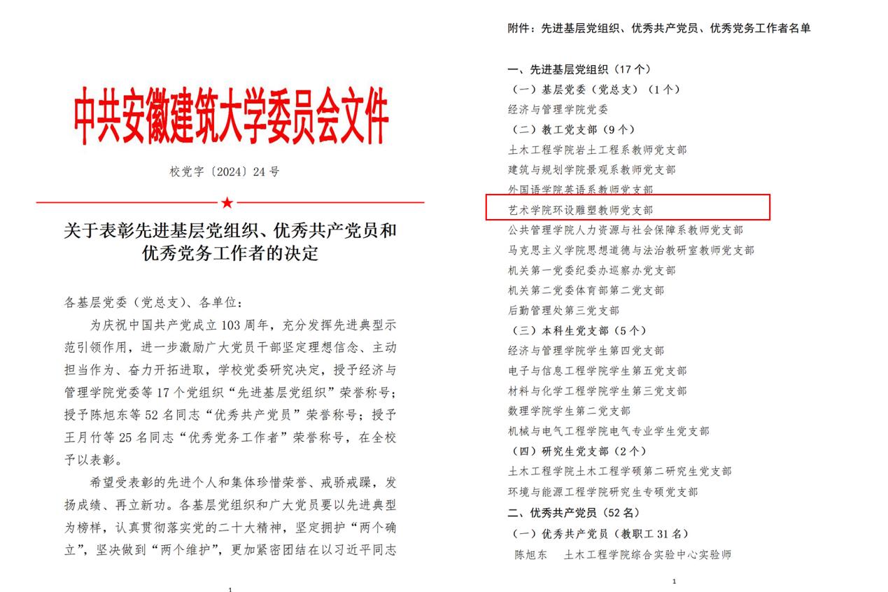 抓支部建设,强化组织引领。样板党支部建设成果显著,环设雕塑教师党支部获学校2024年度先进基层党组织称号;视觉传达教师党支部书记获学校“三全育人”先进个人称号,视觉传达教师党支部通过学校第二批新时代党建示范创建和质量创优培育创建单位验收、获得学校第三批全省高校“双带头人”教师党支部书记工作室推荐。国家一流专业动画专业1名党员教师获国家社科基金艺术学一般项目立项。