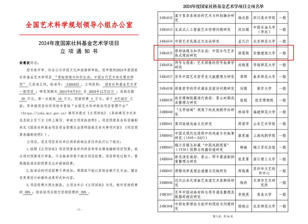 聚焦“进”,科研工作再创新高。获国家社科基金艺术学项目立项1项、安徽省哲学社会科学规划项目立项2项、安徽省文化和旅游科研课题立项1项、2024年安徽省教育厅高校人文科学研究重点项目2项。教师参编的1项国家标准正式颁布。安徽省文旅创新发展研究院、安徽省徽州雕刻工程技术研究中心两个省级科研平台开放课题立项6项、主任基金项目立项5项。完成1项科技成果转让,完成学院32项存量专利盘活工作,信息录入国家专利导航综合服务平台。教师共发表学术论文44篇,出版专著2部。其中SCIE论文9篇、SSCI论文1篇、EI论文5篇,本科高校学报论文16篇、其他论文13篇。获得专利9项,其中发明专利1项、实用新型专利8项,参展艺术作品5件。
