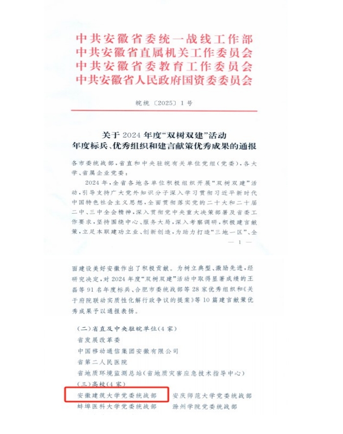 2024年,在省委教育工委和校党委的领导下,学校党委统战部坚持以习近平新时代中国特色社会主义思想为指导,学习宣传贯彻党的二十大和二十届三中全会精神,以及习近平总书记考察安徽重要讲话精神,深入学习贯彻习近平总书记关于做好新时代党的统一战线工作的重要思想,围绕“五抓五好”工作思路,扎实开展“双树双建”主题教育活动,取得一定成绩。