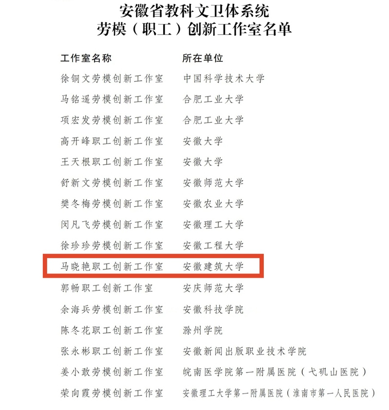 本次省教科文卫体系统重点支持职工创新工作室的成功获评,是在校党委、校工会的悉心指导和大力帮扶下,系统梳理业绩,团队齐心协力的成果。未来,马晓艳职工创新工作室将以省级劳模(职工)创新工作室建设为抓手,激励成员守正创新,充分发挥示范引领、协同攻关、传承技能、培育精神功能,努力打造成为高素质人才培养的重要阵地和弘扬劳模精神的重要载体,凝心聚力为建设国内一流、特色鲜明的高水平建筑大学作出贡献。(作者:林兴勇;一审:林兴勇;二审:江侠;三审:胡雯 马晓艳)