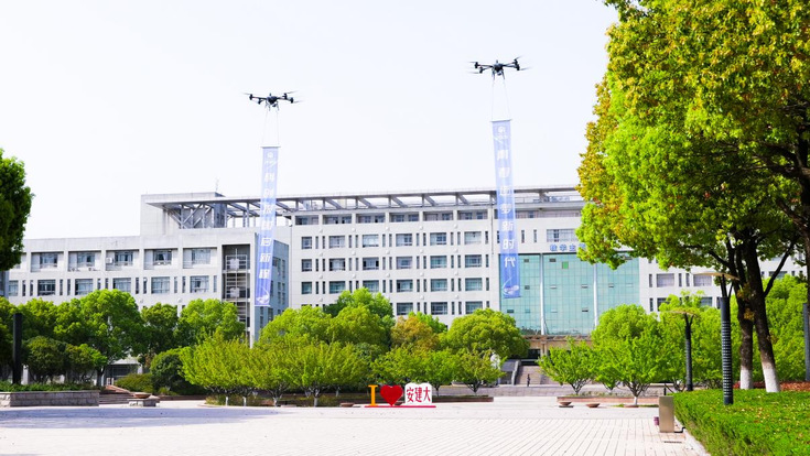 伴随着螺旋桨的轰鸣声,两架大型无人机徐徐南飞,展示出本次科技文化节的主题——“青春逐梦新时代,科创报国启新程”。