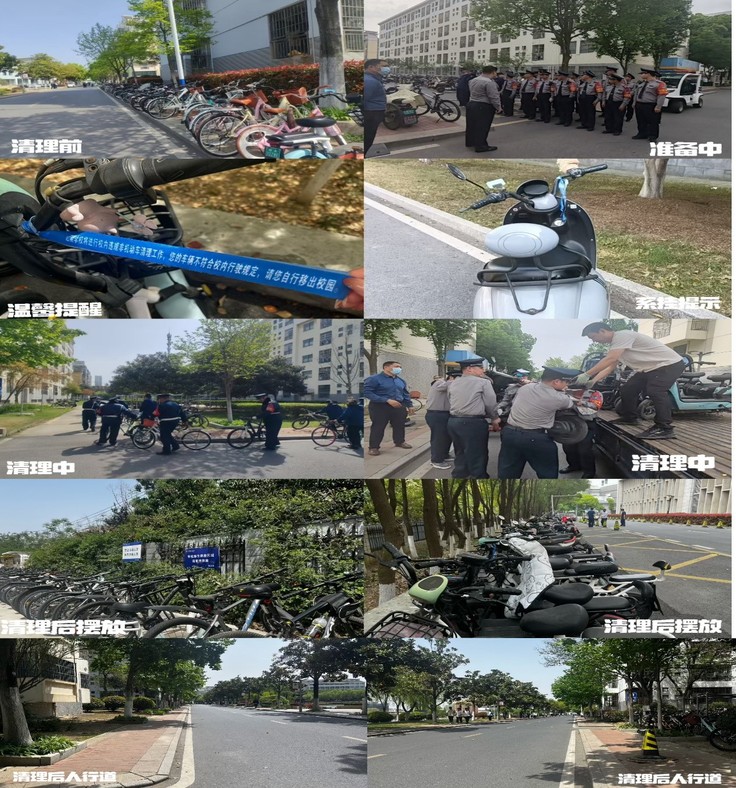 在治理手段上,采取刚柔并济的策略。一方面,充分利用“温馨提示”标识以及锁车警示的方式,以温和的引导方式促使师生自觉规范停车;另一方面,安排专人常态化清理校区内的无牌、无证、套牌车辆以及废弃车辆。同时,学校推进实名认证通行制度并规定毕业生在离校前必须办理证件注销手续,从源头上杜绝假牌套牌现象发生。截至目前,清理校内违规电动车300余辆,非机动车停放规范度大幅提升,校园主干道通行效率显著改善,师生交通安全意识明显增强,一幅人车和谐、路畅景美的校园交通图景正徐徐展开。