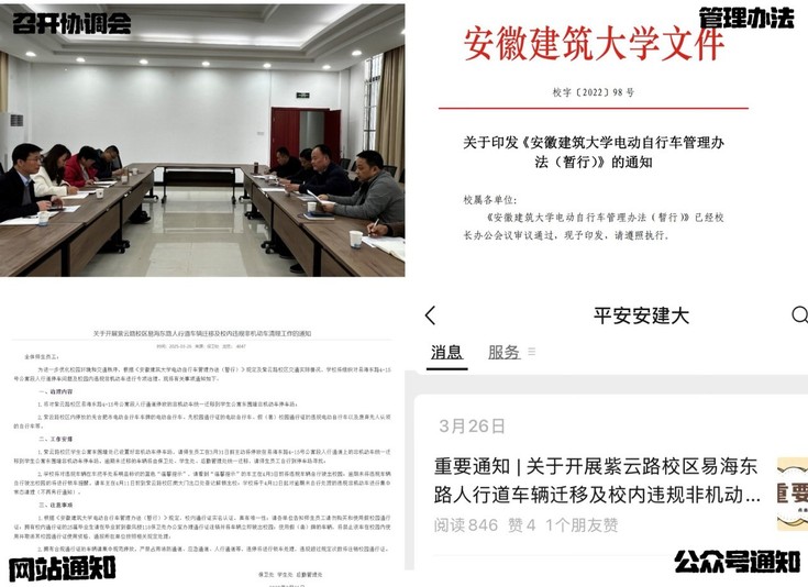 校园交通治理是一项系统工程。由学校保卫处牵头,学生处、后勤管理处等多个部门协同联动,召开专题协调会,明确“制度完善、设施优化、教育引导”的三维路径。学校以2022年出台的《ku游官方电动自行车管理办法(暂行)》为基础,结合校园交通安全教育和巡视整改要求,发布了“关于开展紫云路校区易海东路人行道车辆迁移及校内违规非机动车清理工作的通知”,聚焦紫云路校区易海东路非机动车乱停放以及无牌套牌等问题,迅速制定并实施一系列针对性举措,全力规范交通秩序。