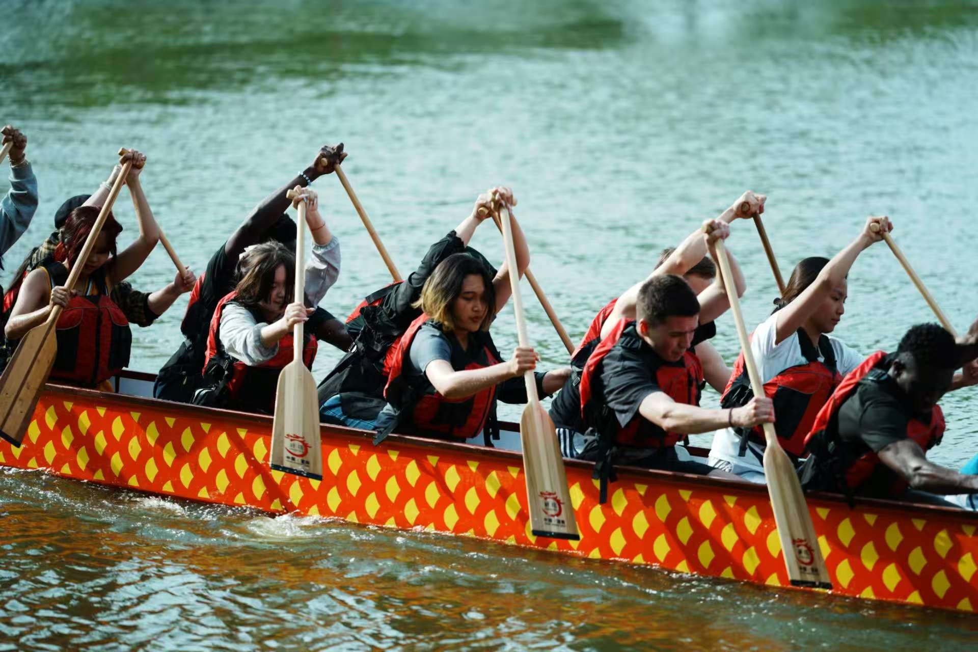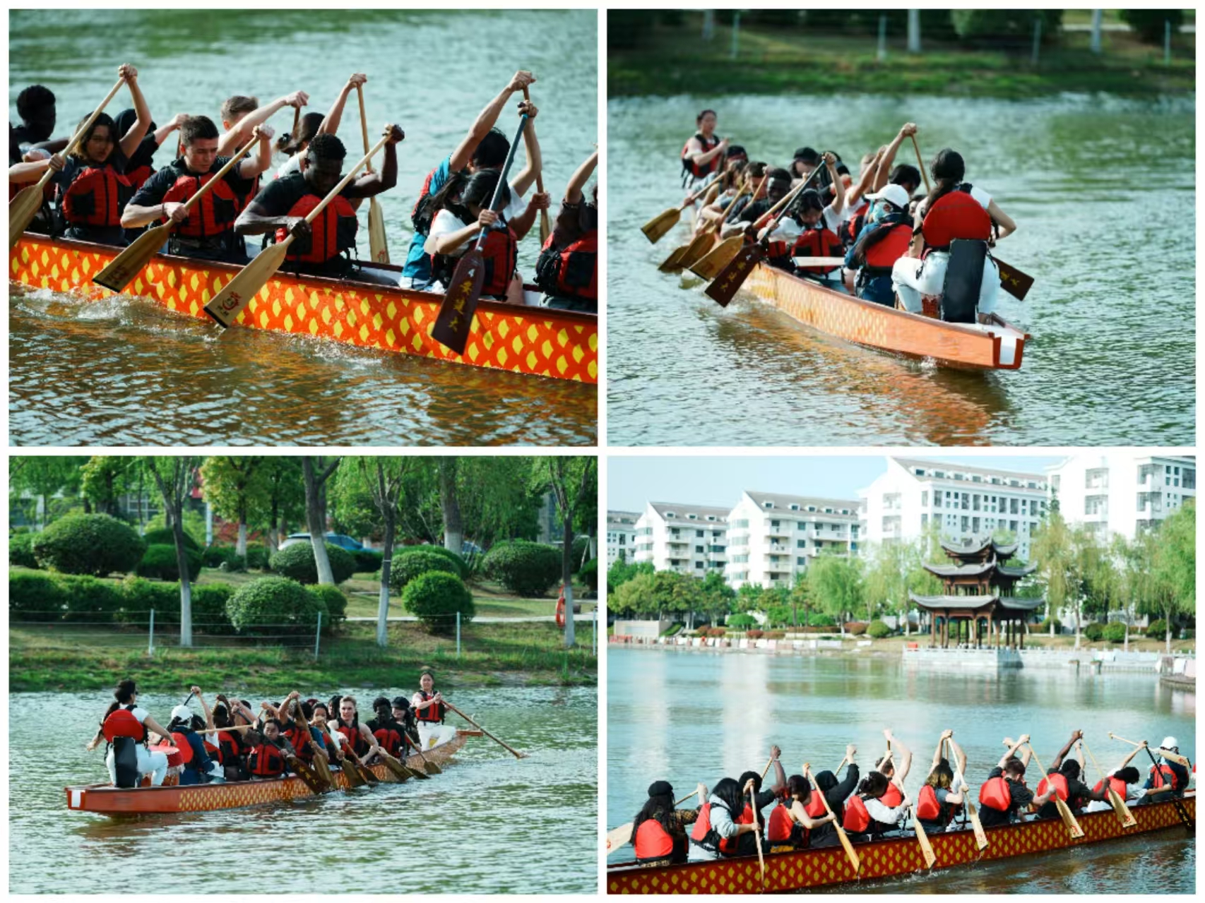 夕阳下的易海湖畔,建大师生们正以桨为笔、以湖为纸,描绘一道活力十足的靓丽画卷。各学院学生代表队与分工会教工队坚持“周周有训练、次次有进步”的备战节奏,在专业教师许敏、汪菊培的指导下,从握桨姿势到节奏配合,从力量分配到战术策略,不断优化团队协作,提升竞技水平。国际教育学院留学生龙舟队的加入更为赛事增添了别样的色彩,不同肤色的学子同舟共济,不仅展现了中华文化的博大精深与包容性,更谱写了文明互鉴的新篇章。