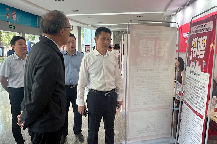 本网讯 4月25日,六安市招才引智专场招聘会在大学生活动中心一楼大厅成功举办。校党委书记马文革来到大学生活动中心一楼招聘会现场,详细了解企业招聘需求、行业发展动态,以及对学校人才培养的意见等。同时,就人才引进政策细节、高校人才与地方产业需求的精准对接方式,以及如何建立长效的政校人才合作机制等方面与六安市人社局工作人员进行交流,旨在进一步推动学校人才培养与地方发展需求的紧密结合。六安市人社局党组成员、副局长李小天、六安市人才中心主任孙祖文以及学院书记、副书记参加招聘会。