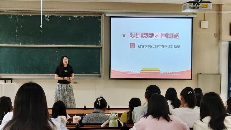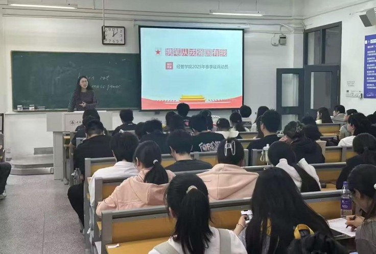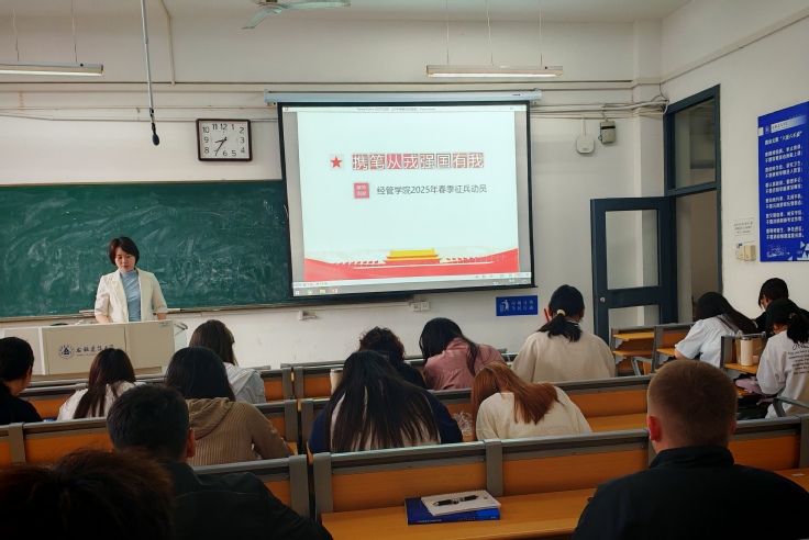 本网讯 为响应国家号召,落实学校2025年征兵工作动员会精神,近期,ku游官方经济与管理学院组织各专业年级开展“携笔从戎 强国有我”征兵宣传教育系列活动,通过主题班会、退役士兵宣讲、网络宣传等方式,全方位点燃学子参军热情。