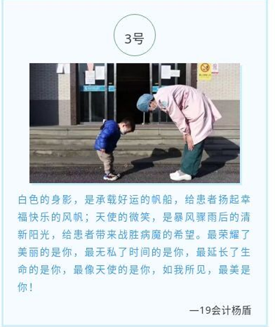同学们积极参加,用语言表达对广大医护人员的感谢与敬佩并用相机记录下疫情期间那些温暖的瞬间,描绘出白衣天使的巨大贡献与无私,表达了对于他们的敬意。“在恐慌中挺身而出,不计后果,义无反顾,用生命换世界一片安宁与光明”是对奋战一线的白衣天使们最完美的写照。