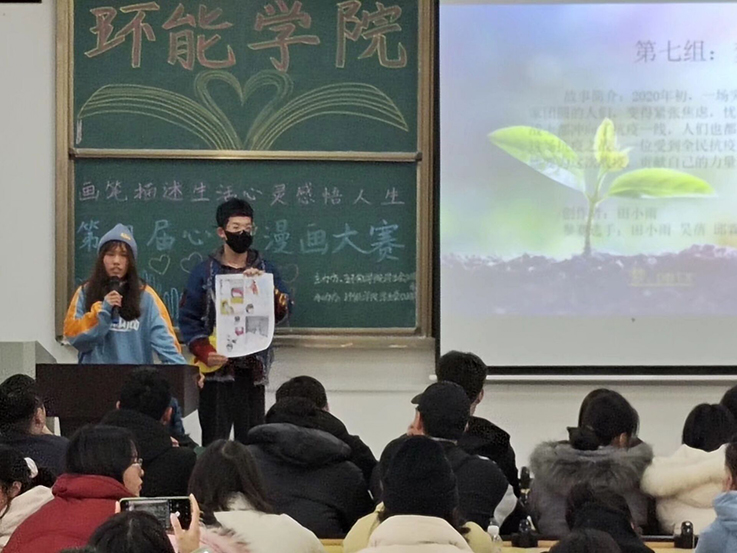 各专业代表队伍围绕大赛主题,通过漫画作品展示大学生的心理健康意识和心理健康水平,活动现场气氛活跃,选手们以饱满的热情展示精心准备的漫画故事,以丰富的内容和细腻的画风打动在场的评委和观众,最终,来自2020级建环专业的第五组和2020级能动专业的第六组荣获桂冠。