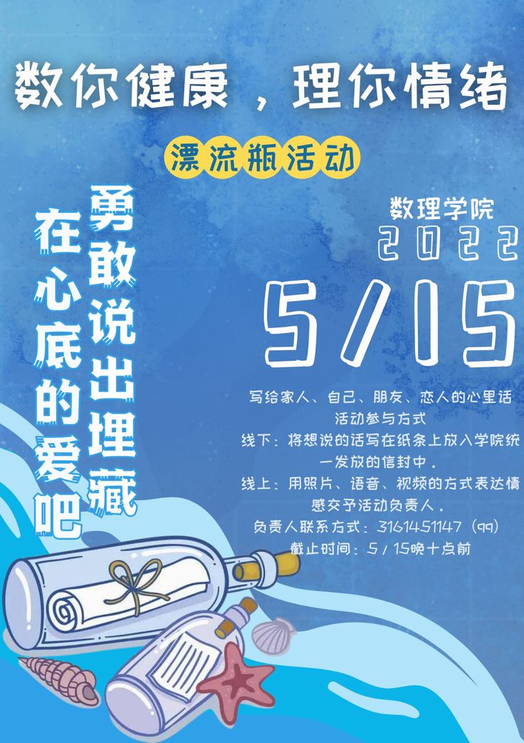 为促进大学生心理健康成长,拉近学生之间心与心的距离,根据学校第十八届心理建康月活动安排,5月15日,数理学院开展"数你健康,理你情绪"“漂流瓶”主题活动,勇敢说出藏在心中的爱。
