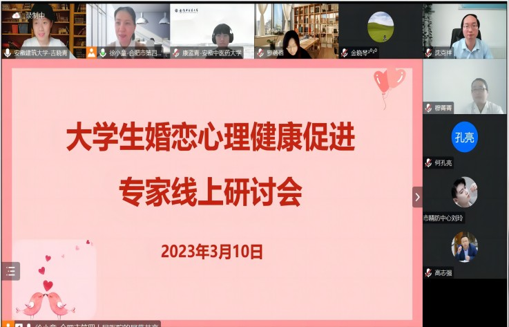 本网讯 为充分发挥“校、医”联动机制在大学生心理健康知识传播、心理危机干预中的重要作用,3月10日下午,由合肥市第四人民医院(安徽省精神卫生中心)主办的大学生婚恋心理健康促进专家研讨会在线上成功举办。合肥市第四人民医院相关精神科专家,中国科技大学、合肥工业大学、安徽大学、安徽中医药大学等七所高校的心理健康教育专家参加了此次研讨会。学校心理健康中心吉晓青老师应邀参会。
