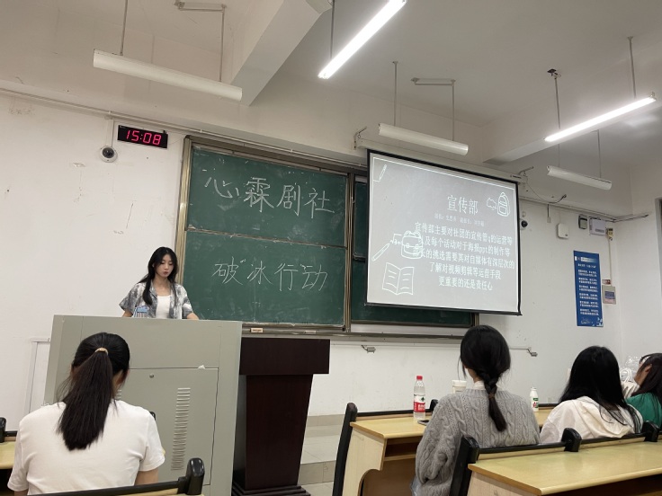 见面会中,剧社社长首先向新成员们介绍了心霖剧社的成立初心、作用意义、主要活动及各部门的任务分工等基本情况。剧社各部门骨干依次发言,对新生力量的加入表示欢迎,并分享了自己在加入社团后的成长与收获。接着,社团指导老师管皓宇作总结发言,他介绍了社团的宗旨---“发展兴趣、激发潜能、助人自助、共同成长”,并就2023届新成员的社交生活和个人提升给出意见和建议,对社团活动的目标提了要求,希望社团可以利用心理情景剧这种艺术表现形式展现当代大学生的生活场景,解决大学常见的心理困惑,提高学生的综合素质,丰富校园文化。