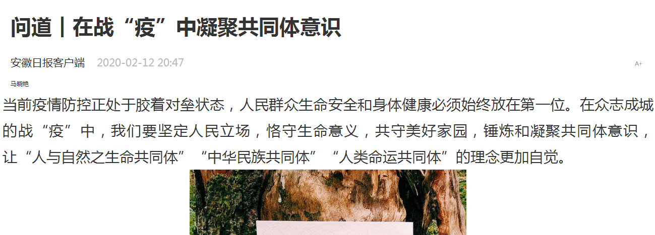 编者按:在当前抗击疫情关键阶段,我们要坚定人民立场,恪守生命意义,共守美好家园,锤炼和凝聚共同体意识,让“人与自然之生命共同体”“中华民族共同体”“人类命运共同体”的理念更加自觉。2月12日,安徽日报发表了我校马克思主义学院教师马晓艳的文章《在战“疫”中凝聚共同体意识》,学习强国平台也进行了转载报道。