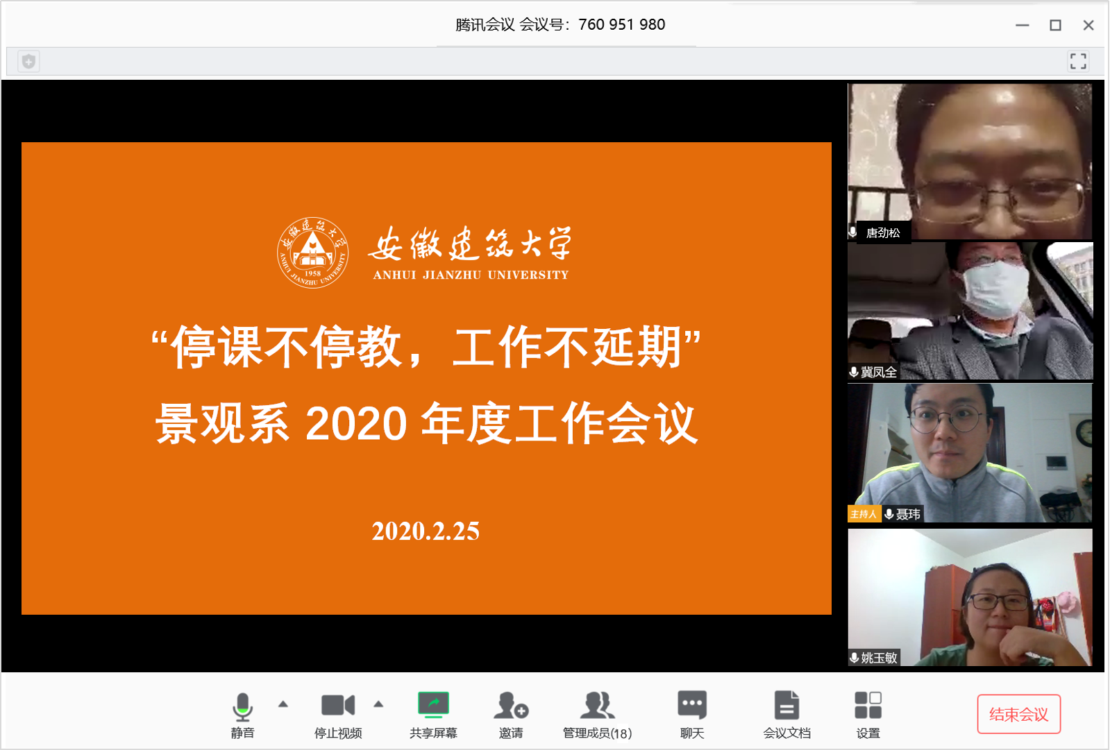 本网讯 为贯彻落实以习近平同志为核心的党中央关于抗击疫情重要指示精神和教育部、教育厅、学校学院相关工作文件要求,最大程度降低疫情对教学带来的影响,圆满完成2020年度教学科研及相关工作任务,2月25日,建规学院景观系利用网络语音直播举行“停课不停教,工作不延期”2020年度工作会议,景观系全体教师参加会议。