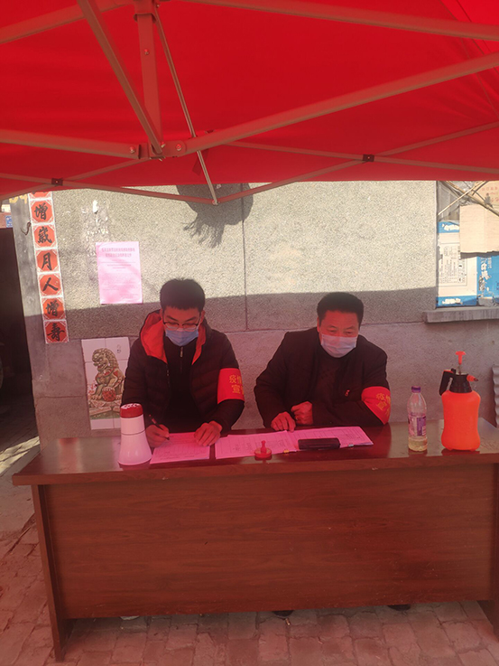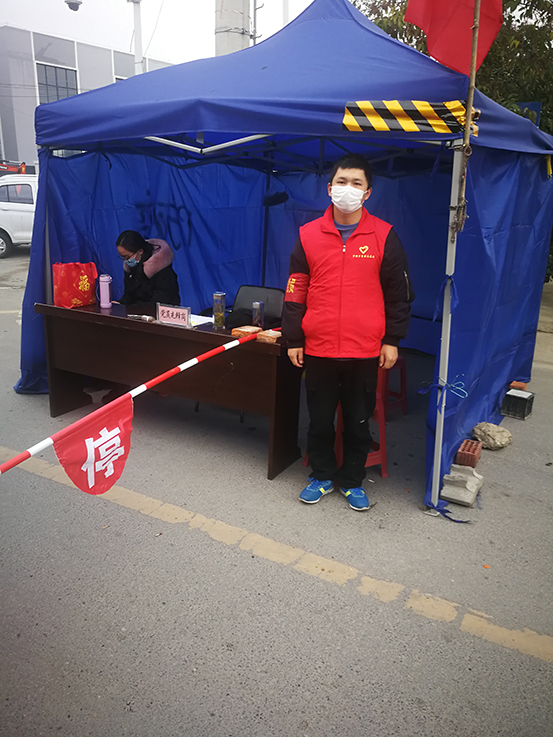 第一学生党支部党员仇善博从正月初二开始,每天早晨8点在村街头值班站岗,对过往车辆人员登记信息,测量体温,并向村民宣传防护知识,每天晚上都值班到十点,他说,战“疫”当头,虽心系武汉,但不能前往,唯尽绵薄之力,守护一方家乡。