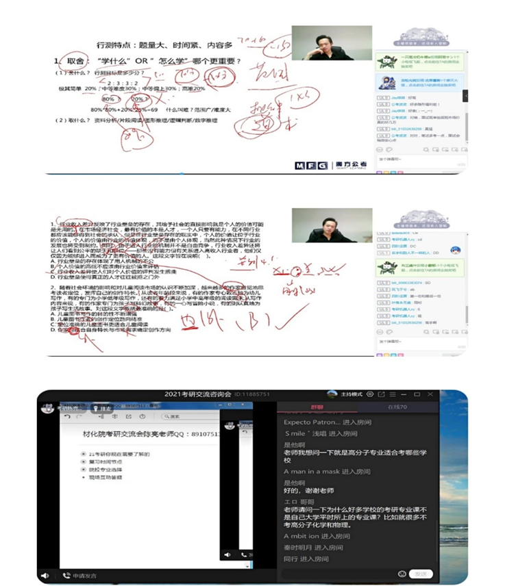 针对摸排所有学生的情况,分别联系了专业系主任、校外考研指导教师和专业内受学生欢迎的教师,根据材化学子的特点,分考研、考编制和就业三个方面精准投送,有针对性的组织线上直播。