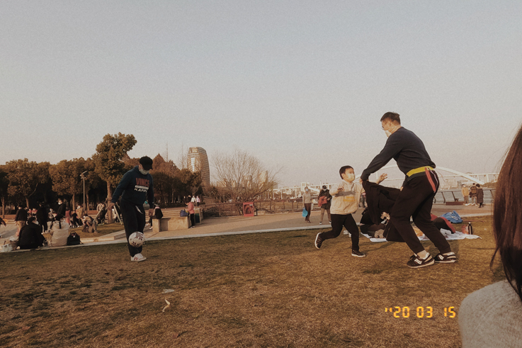 在家隔离了很久的人们都戴着口罩到附近的公园和亲友们进行简单的娱乐活动。