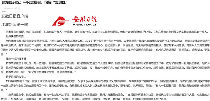 编者按:困难面前有大爱,无论有多危险,总有那么一群人不计报酬,挺身在第一线。或许你不知道他们是谁,但你一定会记得他们为了谁。在肥东经开区新时代文明实践站就有这么一群人。3月25日,安徽日报报道了我校研究生杜涛的志愿服务事迹。