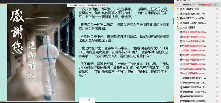 活动伊始,18级道桥一班王辰阳同学在比赛群内发起通话,参赛同学按照顺序依次分享屏幕,以PPT的形式为大家讲述抗击疫情同胞的感人事迹。这场比赛向大家介绍了许许多多平凡又伟大的人:有抗击疫情劳累过度,以身殉职的钟进杏医生;有身患渐冻症,却坚持与时间赛跑、与病毒斗争的院长张定宇;有舍小家顾大家、无私奉献的白衣战士何雯……最后,19安全一班的柏雨晴同学通过其动人的演讲、出色的PPT制作获得了本次比赛的一等奖。在举办完比赛后,许多观众也讲述了自己的感受,表达了自己对抗击疫情同胞的敬意。