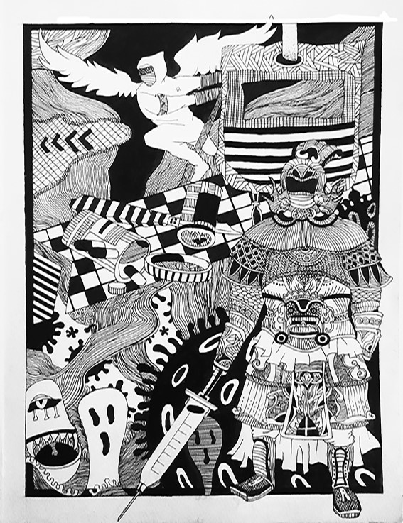 18级视觉传达设计专业郭舒情将阅读《日内瓦医生》的感悟与当前抗击疫情相结合,创作了黑白装饰画《战疫中的英雄》。在这本书中,作者对生命有着的独特思考,主人公作为一名医生,自始至终怀揣着医者的职业操守,不畏险阻,救死扶伤。在2020年发生的新冠肺炎疫情的面前,医生们毫无畏惧地冲锋陷阵,展现出了“舍小家,为大家”的高尚情操,深受同学们敬佩。