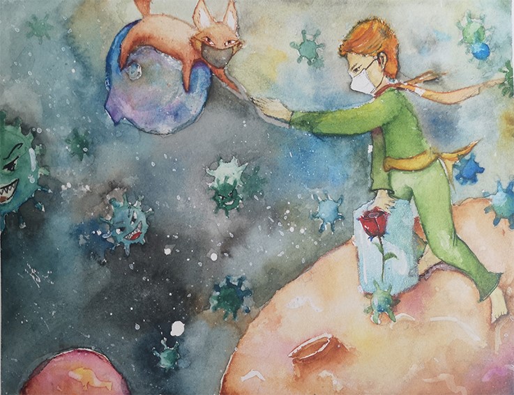 18级环境设计专业邓棱月从《小王子》一书中获得了创作灵感,完成了水彩绘画作品《守护》。小王子保护了玫瑰,又照顾了狐狸朋友,正如同我们的医护人员,保家卫国,以大无畏的精神风貌传扬着仁心医者的勇气与担当。