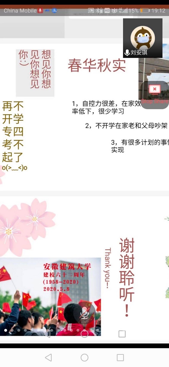 主持人介绍了本次活动的意义,活动负责人共享主题材料后。分别通过“分享居家心理变化”、“在线排忧解难”和“与更好的我同行”三个板块展开本次活动。参与活动的同学先后倾诉了居家期间遇到的心理不适以及担心与同学老师的相处问题;辅导员在线普及了心理健康知识,观看心理健康视频,分享了自己的居家心理调整方法,帮助同学们进一步认识自我,正视心理问题,在欢声笑语中同学们敞开心扉,增进彼此间的沟通与交流,建立和谐的人际关系。