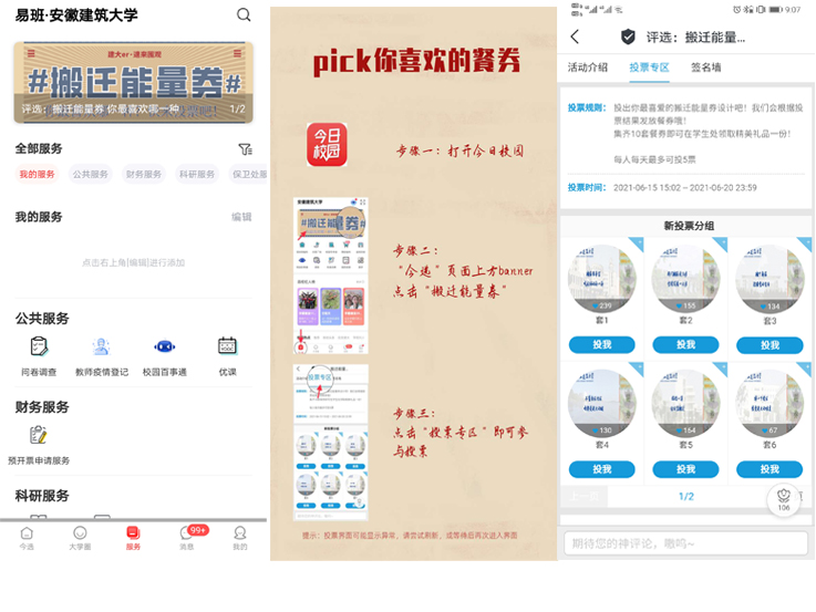 营造氛围,绘就线上线下“同心圆”。为保障搬迁工作安全、有序、顺利进行,相关部门通过调研、座谈、走访等形式摸排掌握学生的思想动态,切实响应学生诉求,回应学生关切,确保学生充分理解和支持学校的政策及决定。学校以搬迁工作为契机开展好学生爱校荣校教育,设计南北校区共10套“搬迁能量券”,并通过“易班·今日校园”开展投票宣传活动,为搬迁工作营造积极向上的正能量氛围,券上的口号如“搬家很辛苦,吃点好的补一补”“掐指一算,今日宜搬迁”“我们搬家走几步,学校发展一大步”“搬个新家,迎接党的生日”等设计充分结合热点,融合校园文化,深受学生喜爱。通过线上线下宣传动员,做好搬迁工作的思想准备。