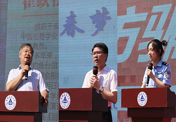 崔跃松,供职于安徽省社会科学院。安徽省委讲师团首批高端宣讲专家;安徽省演讲学会会长,中国伦理学会理事;全国思想政治工作科学专业委员会委员;中国人民解放军东部战区特聘理论教员。多年来,他潜心研究党建、职工和青少年思想教育工作。曾担任2008年北京奥运火炬手和2010年上海世博会形象大使专业指导老师。曾两次应英国剑桥大学和牛津大学邀请发表专题演讲。著有《别让借口占上风》、《演讲的艺术》等系列丛书。崔跃松教授运用了典型的案例、动人的故事、质朴的语言,用三个数字作为主线,教育在座的大学生要“做新时代有理想、有作为的大学生”:首先是2个词语——责任和信念,当代大学生不仅要拥有对未来生活坚定的信念,更要肩负起责任;第二是5个字“那都不是事”,崔教授引用了著名文学家林清玄的一句话“苦难是一所大学”,面对困难、挫折、诱惑并且战胜它们,终将遇见彩虹;最后一个数字是“0”,崔教授告诫大家要“0懈怠”,大学期间要多读书、多背诗、多见世面,为将来大有作为打下坚实的基础。