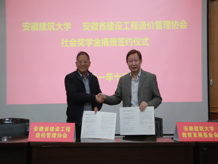 学校教育发展基金会理事长宋箭与安徽省建设工程造价管理协会理事长王成球分别代表校企双方进行了捐资助学签约捐赠仪式。(作者:胡韬,贺雅婷;审稿:徐庆和)