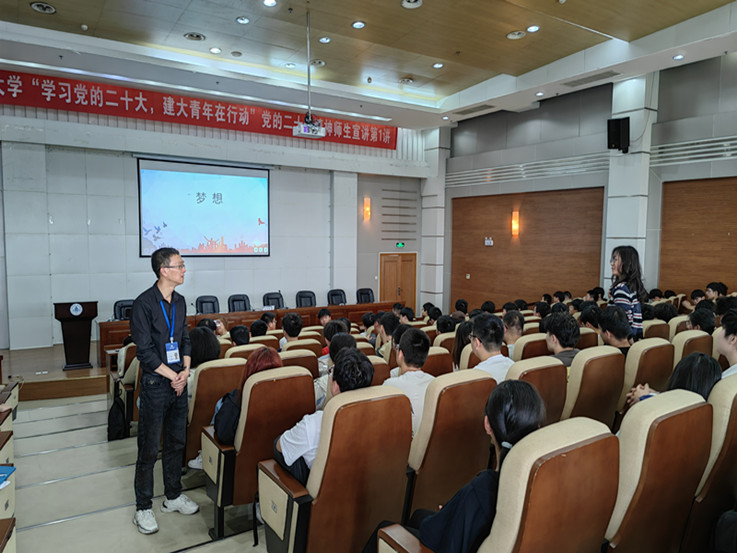 土木工程学院党委副书记马智鑫围绕全面深刻学习领会党的二十大精神,全面贯彻落实党的二十大精神的路径等方面进行了深入浅出的讲解,并以梦想为引言,与同学们互动交流,鼓励建大学子应树立远大理想,坚定信仰信念,涵养道德情操,加快学习成长,勇担强国复兴使命,书写亮丽青春答卷,在全方位推动高质量发展的壮阔实践中建功立业。