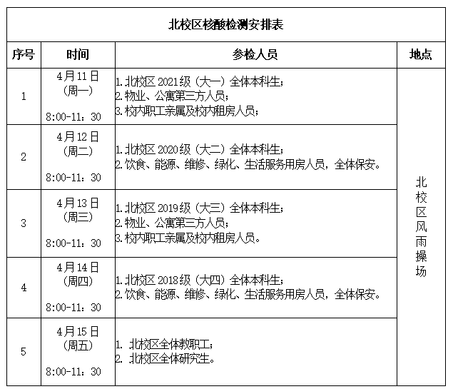 按上级疫情防控部门要求,4月11—15日,学校开展本学期第五轮全员核酸检测,做到一周全覆盖,其中教职工(除下表已安排到本单位的1次检测,另外1次根据核酸检测时间安排表自选,两次核酸检测时间间隔至少48小时)、住校内职工亲属及校内租房人员、第三方服务人员每周至少参加核酸检测2次,具体安排如下: